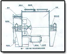本机为卧式筒体,双轴多桨结构混合机体焊制成型.顶部装有喷雾加液装置,物料理自顶部加入,混合后由底部出料。